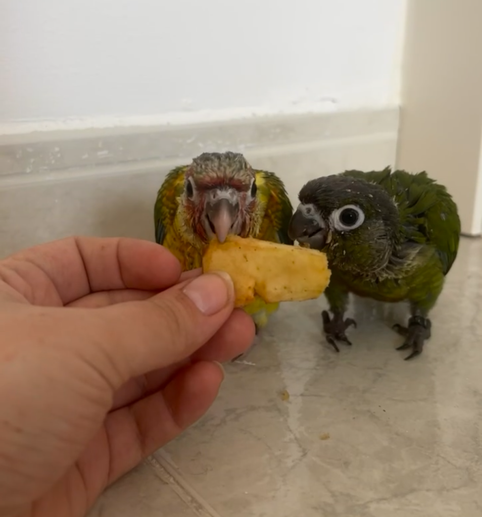 En nuestro propio nido, Wilfri y Gusgus comenzaron su camino frutal precisamente con pequeños trocitos de manzana. Fue increíble ver cómo cada uno reaccionaba diferente.