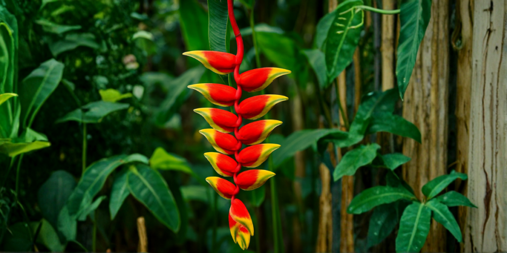 Con sus inflorescencias colgantes de rojo intenso y bordes amarillos, la Heliconia rostrata es una de las especies más representativas cuando se habla de pico de loro planta. Muy popular en jardines tropicales, su presencia es habitual en climas cálidos por su impacto visual.