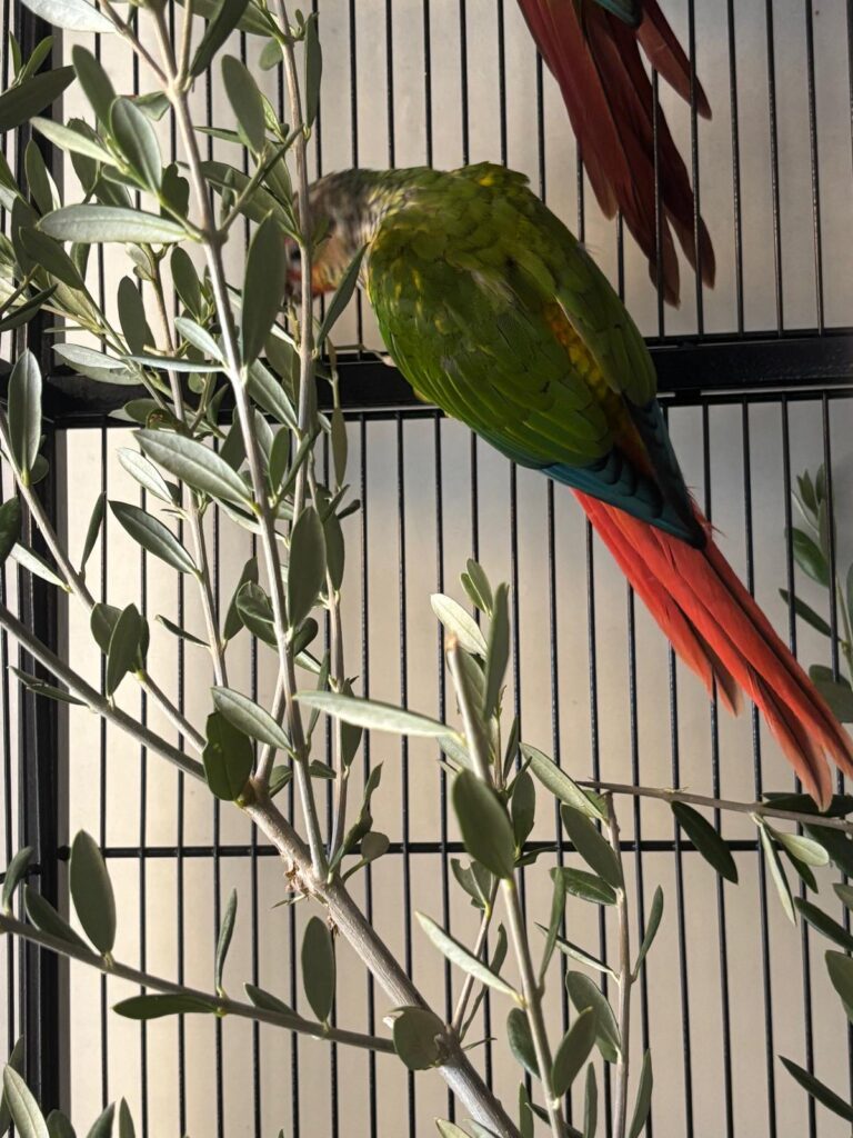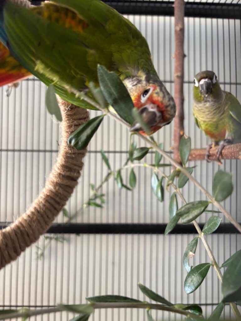 El atractivo visual, aroma suave y forma de las ramas convierten al olivo en un material interesante para enriquecer el hábitat físico y sensorial del loro, con beneficios tanto físicos como mentales.